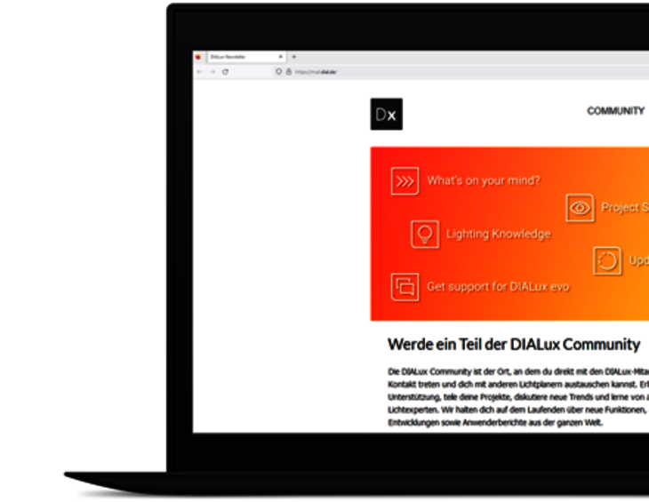 Der Newsletter informiert dich rund um DIALux, Lichtplanung, -technik und -steuerung. Wir halten dich regelmäßig auf dem Laufenden – etwa einmal pro Monat: