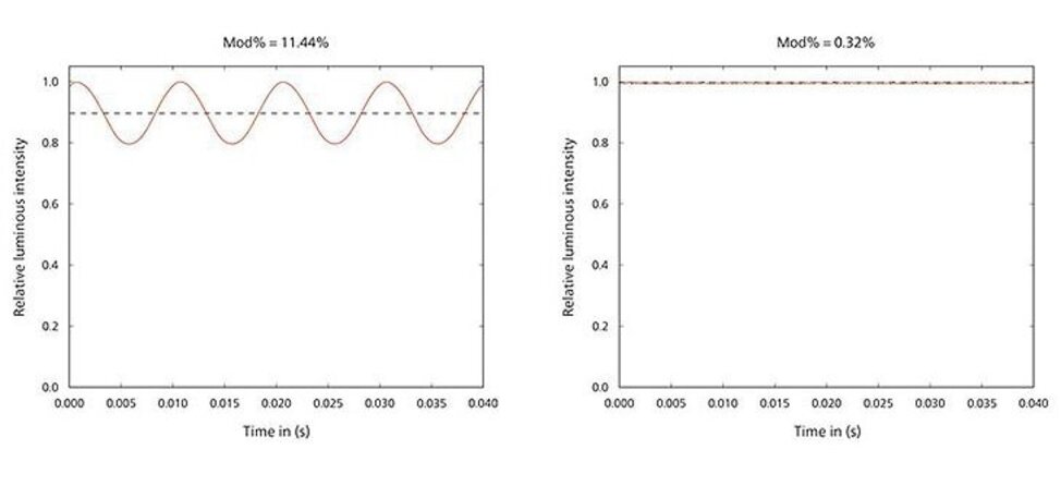 Modulation is known as the Michelson Contrast and describes the interval between the minimum and maximum of an oscillation. So a rectangular wave/oscillation such as in the operation with PWM, would be almost 100 % since the LED is constantly switched on and off at a full operating current/voltage. By comparison a halogen lamp on mains voltage has a mod % of approx. 10 %. LEDs operating on direct current have almost no mod % at all, as measurements made at DIAL have shown.