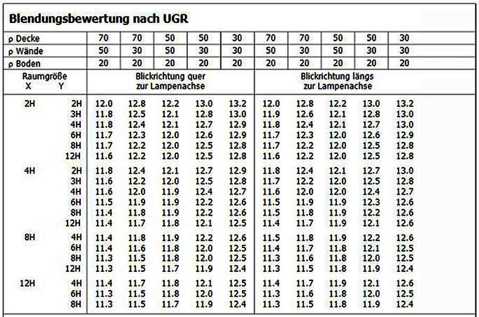 According to the tabular method the floor has a maximum degree of reflectance of 20 %, walls of 30 % to 50 % and the ceiling of 50 % to 70 %. White walls or ceilings with a degree of reflectance of 75 to 90 %, such as frequently occur in architecture, are not taken into consideration in the tabular method. In the tabular method the observer can be positioned either across or along the luminaire axis. The tabular method does not recognize an angle of vision diagonal to the luminaire axis and is based exclusively on rectangular room geometries. This method must be applied for each individual type of luminaire if different luminaires are present in one room, since each type of luminaire has its own UGR table.