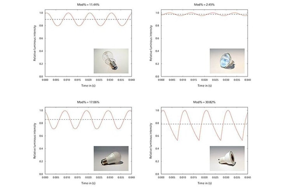 Die Modulation ist auch als Michelson Kontrast bekannt und beschreibt den Abstand zwischen Minimum und Maximum einer Schwingung. So wäre eine Rechteckschwingung, wie z. B. bei einem Betrieb mit PWM, nahezu 100%, da die LED bei vollem Betriebsstrom ständig ein- und ausgeschaltet wird. Im Vergleich dazu hat eine Halogenglühlampe bei Netzspannung einen Mod % von ca. 10 %. Mit Gleichstrom (CCR) betriebene LEDs weisen praktisch keinen Mod % auf, wie die Messungen im DIAL-Labor gezeigt haben.