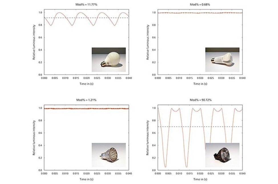 Alle Lampen wurden an einer stabilisierten elektrischen Versorgung betrieben, um etwaige Netzstörungen ausschließen zu können. Gut zu erkennen ist, dass alle untersuchten Produkte mit einer Frequenz von ca. 100 Hz flimmern, die Bandbreite der Modulation aber bei gleicher Frequenz zwischen <1 % und >90 % schwankt.