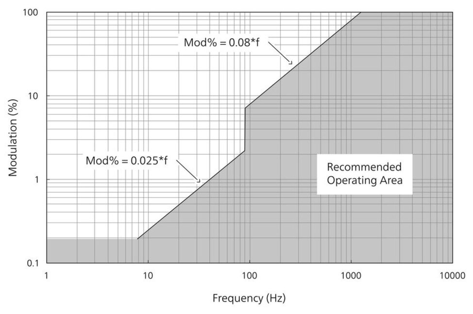 Bis in den Bereich von ca. 2,5 kHz kann es durch die Überlagerung von verschiedenen Schwingungen zu Stroboskop- oder Perleffekten kommen. Gerade bei schnelldrehenden Maschinen kann es zu dem Eindruck kommen, dass die Maschine stillsteht, was zu einem erhöhten Verletzungsrisiko führen kann. Uneingeschränkt empfohlen wird ein Betrieb der LED bei über 3 kHz, weil es hier zu keinen nachweisbaren Auswirkungen mehr kommt. Darunter wird ein Grenzwert in Abhängigkeit zwischen Frequenz und Modulation formuliert. Grundsätzlich sollte, unabhängig von der zugrunde liegenden Betriebsfrequenz, eine möglichst kleine Modulation angestrebt werden, auch wenn mit steigender Frequenz eine höhere Toleranz angenommen wird. Dies wird in der folgenden Grafik als Funktion aus Frequenz und Modulation erläutert: