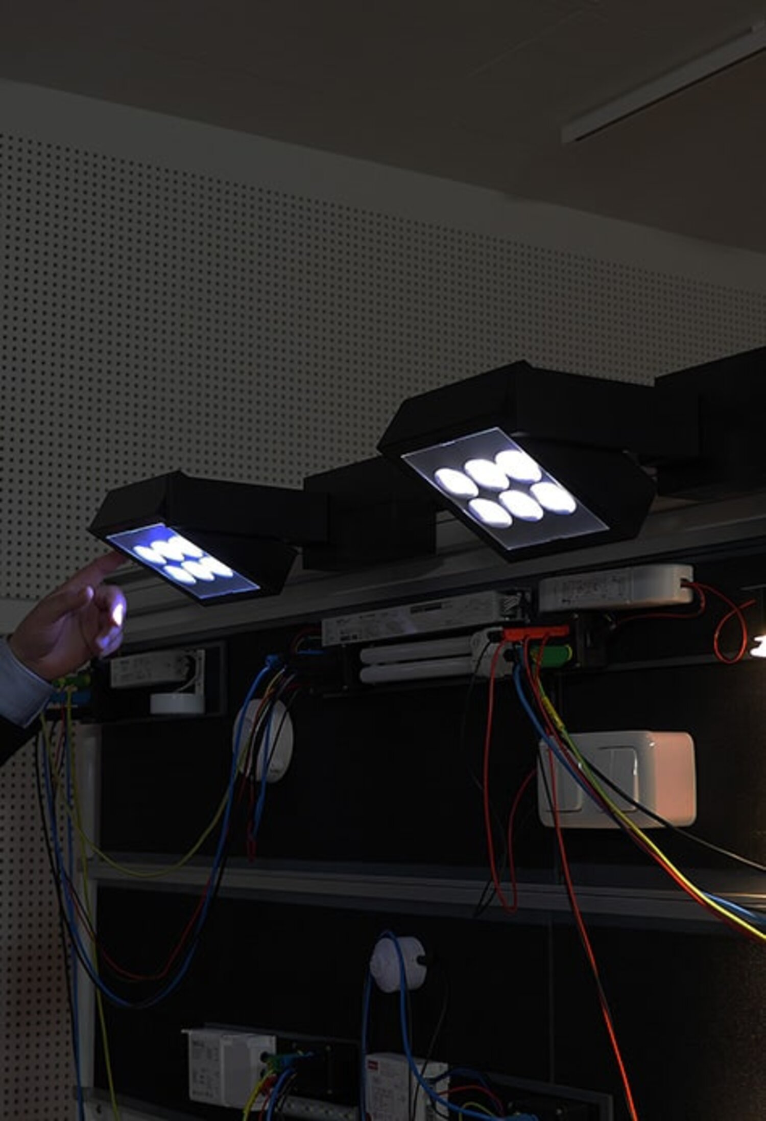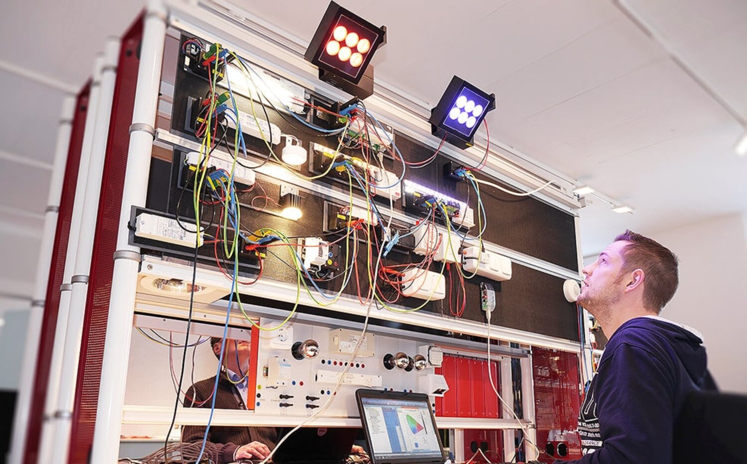 Neben den technischen Grundlagen setzen wir uns intensiv mit der Praxis auseinander. Im Ausbildungslabor arbeitest du mit aktuellen Geräten und Systemen verschiedener Hersteller und lernst, DALI-Anlagen zu planen und zu programmieren.