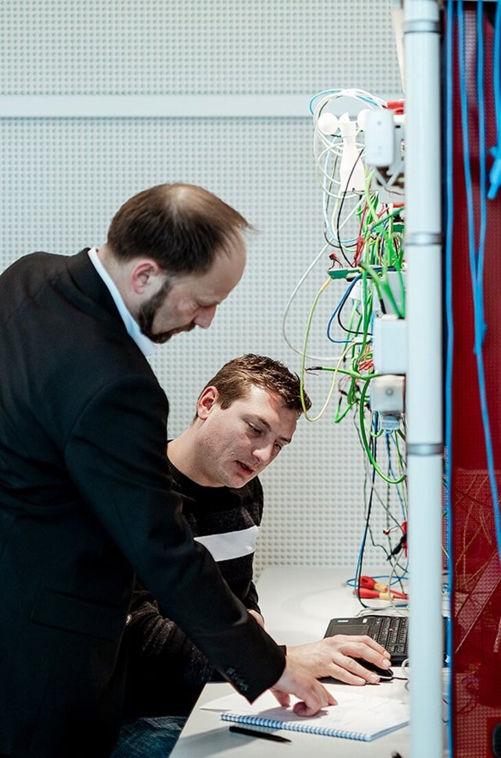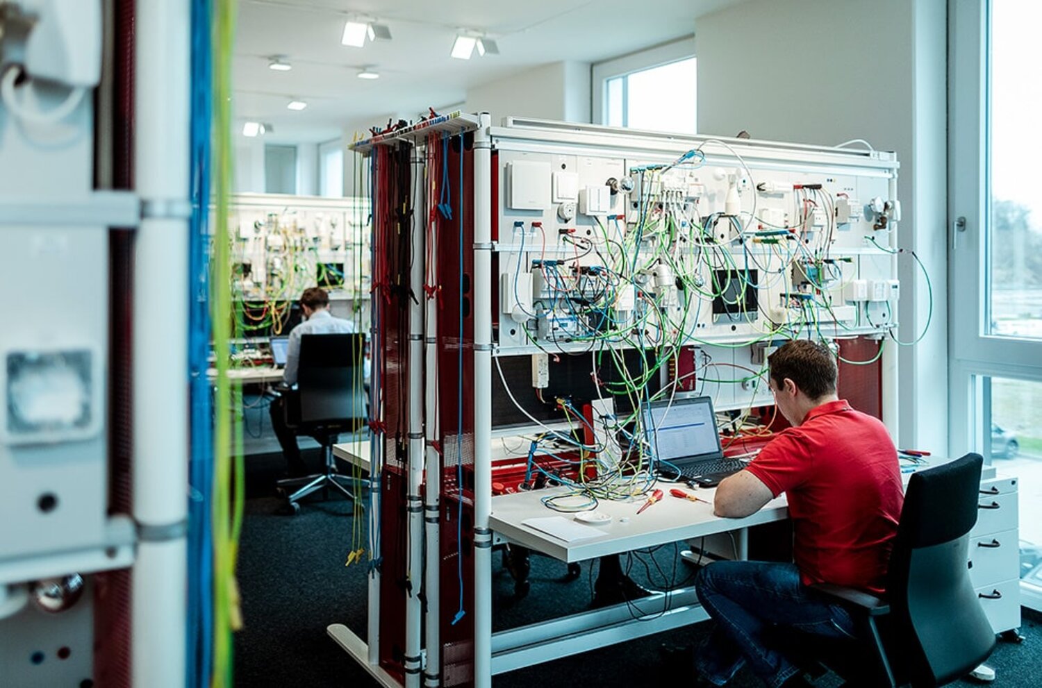 - Praktische Arbeit im Ausbildungslabor, z. B. Steuerung von Licht, Jalousien, Raumtemperatur etc.