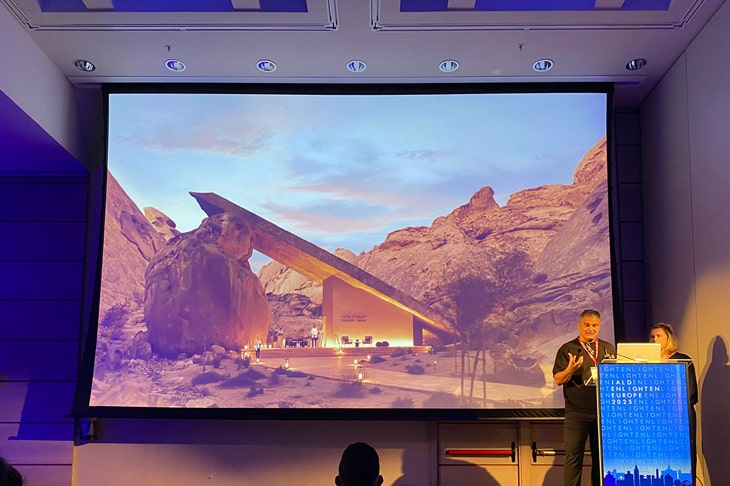 Foad Shafighi, Senior Lighting Designer bei HGA, begeisterte das Publikum mit praktischen Einblicken in KI-Tools, die den Arbeitsprozess von Lichtplanenden grundlegend verbessern können. Er demonstrierte, wie KI-gestützte Systeme Designprozesse unterstützen und beschleunigen, indem sie Aufgaben wie Recherche und Konzeptvisualisierung übernehmen und so mehr Freiraum für Kreativität schaffen. James Simpson, Direktor bei Cooper Candle, öffnete dem Publikum die Augen für die Zukunft des Lichtdesigns in virtuellen Welten, insbesondere im Metaverse. Anhand faszinierender Beispiele aus virtuellen Projekten zeigte er, wie fortschrittliche Gaming-Technologien wie etwa die Unreal Engine neue, grenzenlose Gestaltungsmöglichkeiten eröffnen. Mark Lloyd, Technologe, Leiter und Investor der Gillard Group, forderte das Publikum mit einem zum Nachdenken anregenden Ausblick auf aktuelle technologische Entwicklungen heraus und drängte Lichtplanende ihre Rolle neu zu definieren und innovative Geschäftschancen zu nutzen. „Denkt über Licht nach. Nicht über Beleuchtung.“