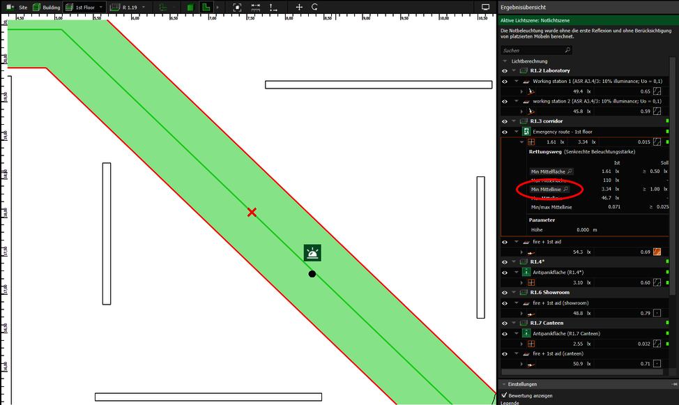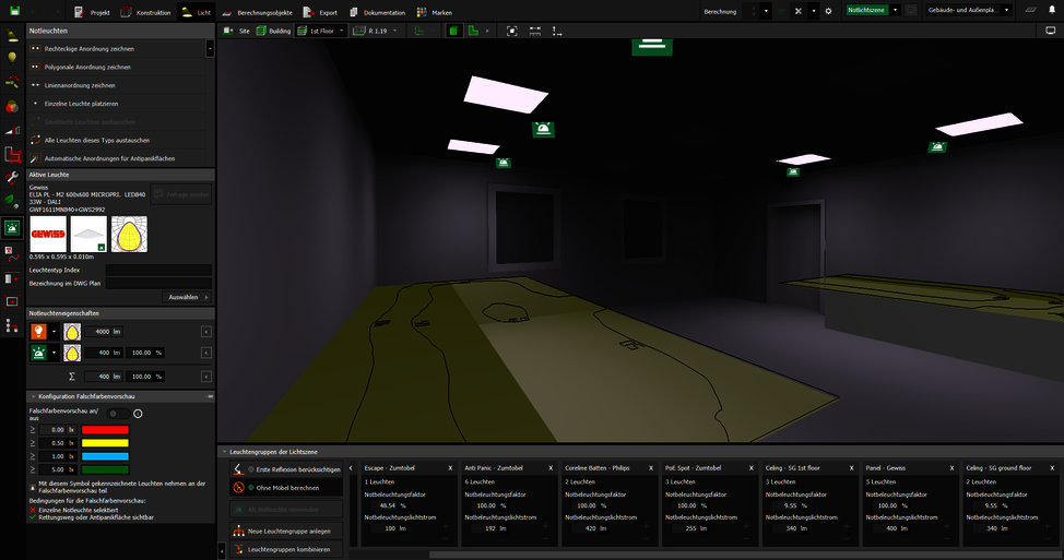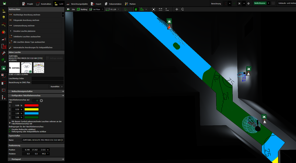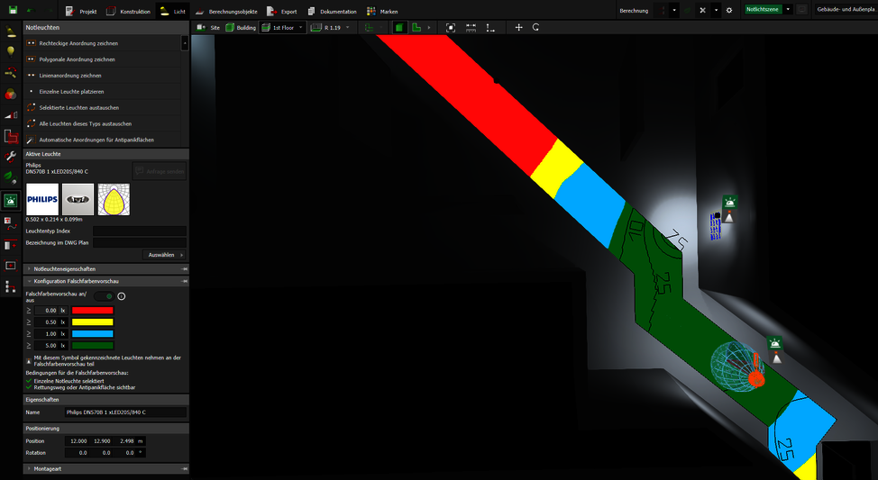 Die Falschfarbenvorschau sollte immer eingeschaltet sein, hierdurch wird die Planungsdauer enorm verkürzt. Denn diese Darstellung erfolgt in Echtzeit und visualisiert direkt die von den Notleuchten erzeugten Beleuchtungsstärken auf den Berechnungsflächen. Eine Berechnung ist in diesem Schritt unnötig und spart wichtige Zeit. Die Planenden haben die geforderten Werte, gemäß der DIN EN 1838, im Blick und können schnell und einfach die Leuchtenpositionen optimieren. Die Falschfarben zeigen die direkte Auswirkung auf die Ergebnisse sobald Leuchtenabstände verringert oder weitere Leuchten ergänzt werden.