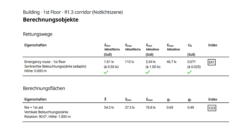 In jeder Art von Innenraum können so mehrere Berechnungsobjekte für Rettungs- bzw. Fluchtwege und Antipanikflächen eingefügt werden. Ist eine polygonale Form der Antipanikfläche erforderlich oder müssen mehrere Antipanikflächen in einem sehr großen Raum berechnet werden, so ist es auch möglich manuell angelegte Bereiche zu zeichnen. Standard-Berechnungsobjekte sind ebenfalls in der Notlichtszene berechenbar. Damit erbringen Planende also auch den normativen Nachweis für Arbeitsplätze mit besonderer Gefährdung oder hervorzuhebende Stellen, wie vertikale Flächen und Treppen.