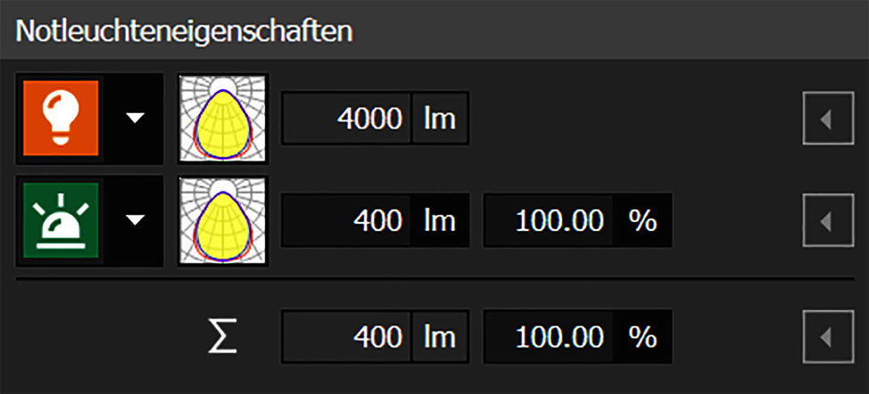 Im Modus Licht und unter dem Werkzeug Notleuchten ist erst einmal jede in DIALux importierte Leuchte für die Notbeleuchtung nutzbar. Grundsätzlich kann der Hersteller Lichtaustrittsflächen definieren, die speziell für die Notbeleuchtung vorgesehen sind. Diese Informationen werden dann automatisch von DIALux evo verwendet. Gibt es diese Daten nicht, nehmen die Planer:Innen die Einstellungen selbst vor. Die Leuchten, die als Notleuchte verwendet werden sollen, müssen bestimmt und die Notleuchteneigenschaften eigenverantwortlich überprüft werden. Der Notlichtstrom oder Notbeleuchtungsfaktor lässt sich einstellen, wobei die beiden Werte ineinander umgerechnet werden. Zudem kann für jede Leuchte im Projekt festgelegt werden, ob sie nur für die Notbeleuchtung, nur für die Allgemein-Beleuchtung oder für beide Fälle verwendet werden soll. Entsprechend werden die Leuchten in der normalen Lichtszene und / oder in der Notlichtszene berechnet.