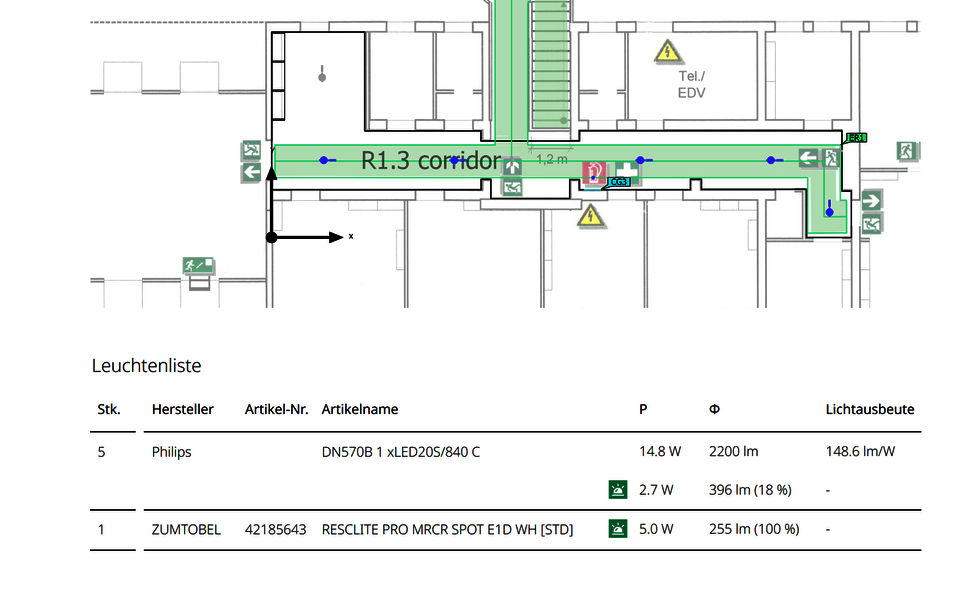 Im Modus Dokumentation ist ein Export der Standard-Lichtplanung, als auch der gesamten Notbeleuchtungsplanung möglich. Darunter fallen alle Berechnungsergebnisse für den normativen Nachweis, Notleuchtendatenblätter, Leuchtenlisten und ein Leuchtenlageplan. Planende können Projektbeschreibungen, wichtige Text- und Bildinformationen hinzufügen und die Dokumentation anschließend drucken oder auch als PDF speichern. Ebenso kann der Leuchtenlageplan als DWG-Datei exportiert werden.