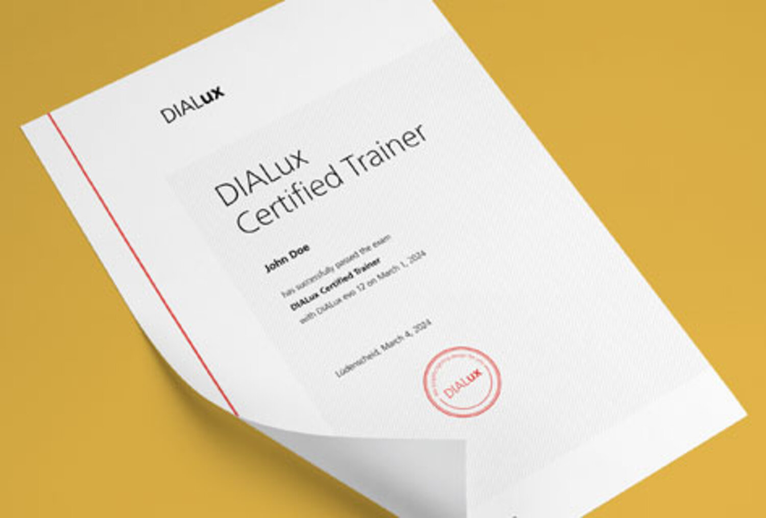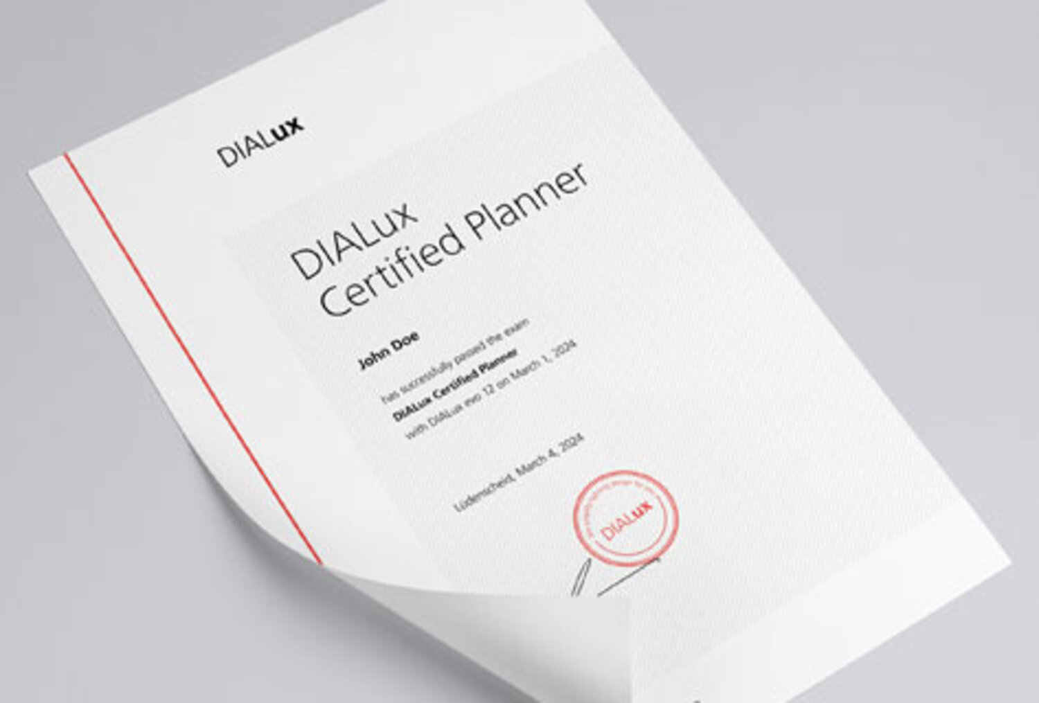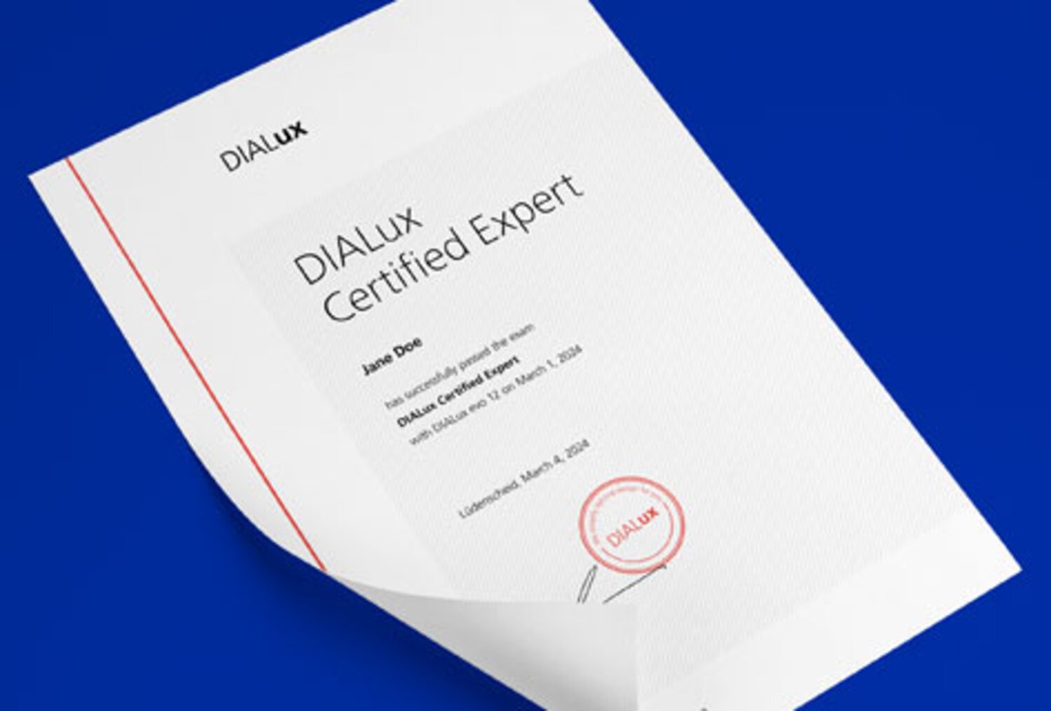 Showcase your lighting design expertise with the DIALux Certification. It officially validates your professional skills in lighting design with DIALux and helps you stand out in job applications, client projects, and presentations.